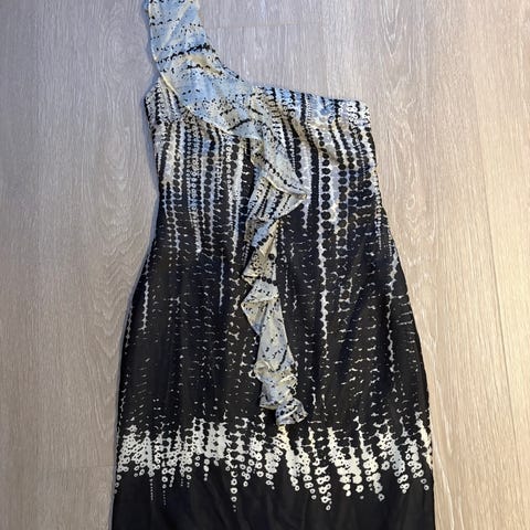 Riccovero kjole i ekte lammeskinn str 36. Sort farge, belte i livet og splitt med knapper i sidene. Kun brukt en gang. Litt skrukkete på bildene fordi den har ligget nedpakket.