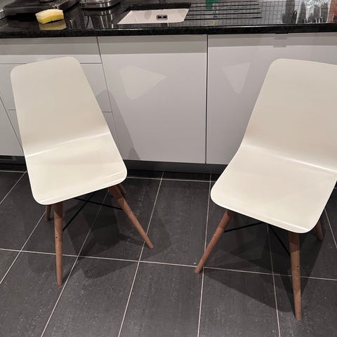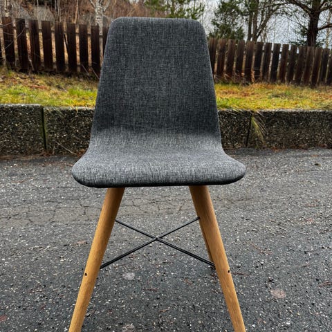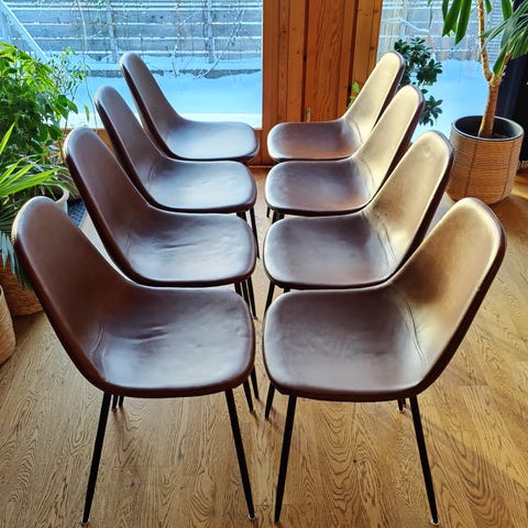 Stolene har hel rygg, synlig plywood-kant og sort understell med metallkryss.