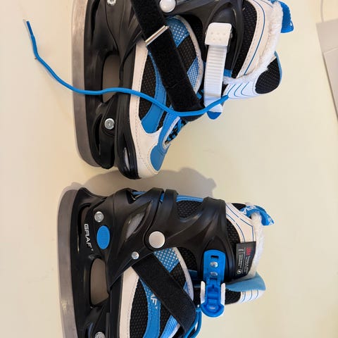 Graf Ishockey Skøyter for barn i justerbar størrelse 31 - 34, farge hvit. Skøytene er brukt av ett barn (men ikke så mye) og er i god stand. De er enkle å justere mellom størrelser med en knapp på siden av skøytene