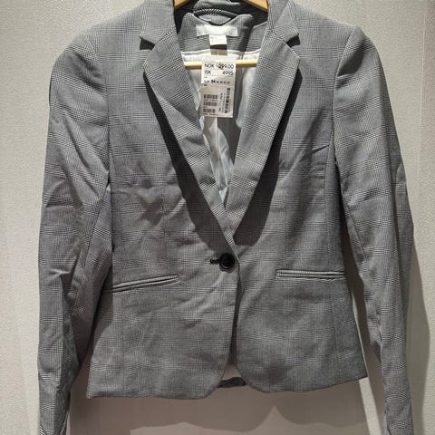 Helt ny blazer str 38 fra Kaffe, med lapp. Aldri brukt! Grå. Armene er uforet. Det grå partiet i sidene er stretch materialet, så den passer de fleste former. Ryggen er foret, som gjør at den faller pent. Passer til det meste, både til hverdag og fest.