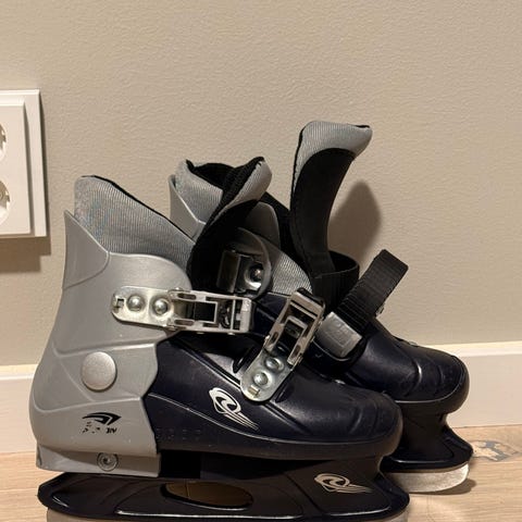 Justerbare skøyter for barn i størrelse 27 til 30. Skøytene har blå og hvite farger og er utstyrt med Thinsulate isolasjon for varme.
