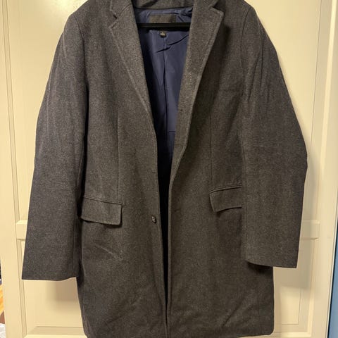Hugo Boss frakk i blå farge, laget av polyester. Jakken er designet for herre og har størrelse 52. Den har lang modell med knappelukking og er egnet for bruk som ytterplagg.