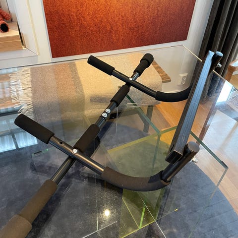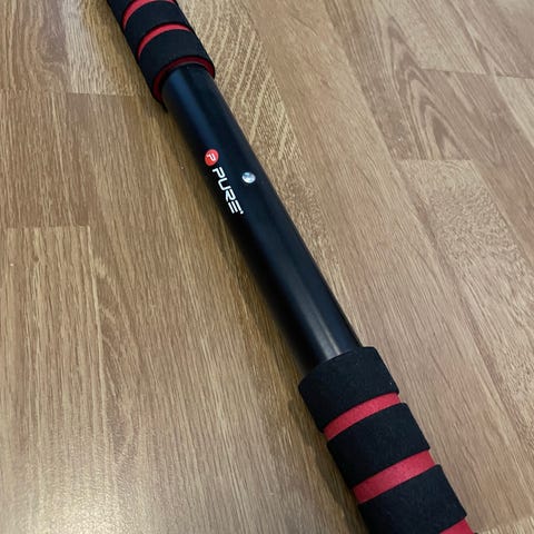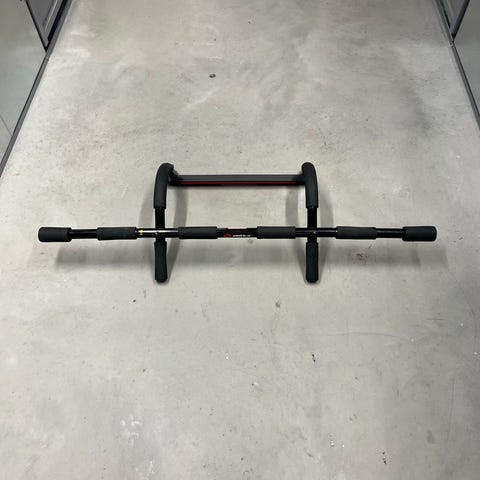 Pull Up bar i svart farge. Utstyr for trening av overkropp, designet for å monteres i dørkarm. Laget for å gi mulighet for pull ups og andre styrkeøvelser hjemme.