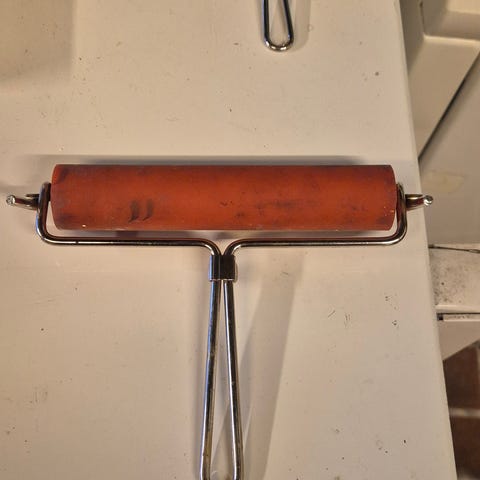 Linoleumsblader med ulike former settes inn i treskaft. Skjærebladene er enkle å sette inn. Lite brukt. Kr 100 pr sett.
