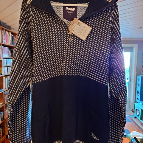 Selger en Bergans Alvdal-genser i størrelse L, laget av merinoull. Genseren har en grønn farge med mønster og ribbestrikkede kanter ved ermer, hals og midje. Brukt kun et par ganger, vasket 1 gang!