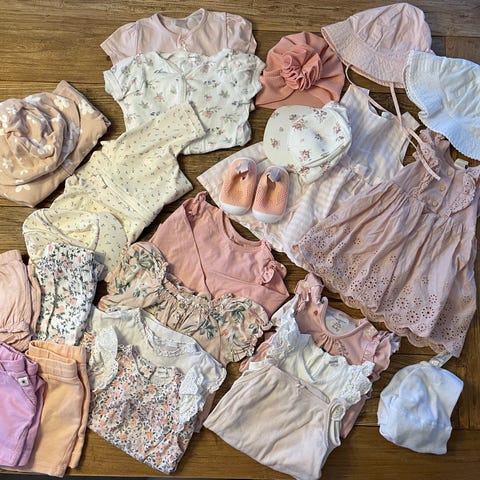 Fine klær i duse farger💛🩷🤍 Klærne er i god stand, uten hull eller synlige flekker/merker☺️ Merker som bl.a Newbie, Lindex og HM.
