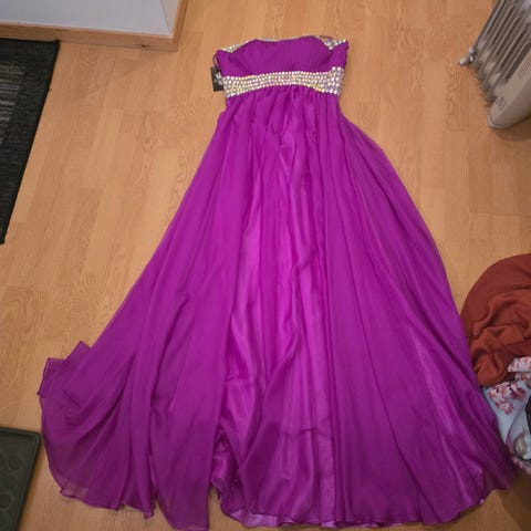 Kjole til spesiell anledning i størrelse S, laget av satin i rød farge. Kjolen har detaljer som snøring på baksiden og dekorative elementer på overdelen. Passer for kvinner.
