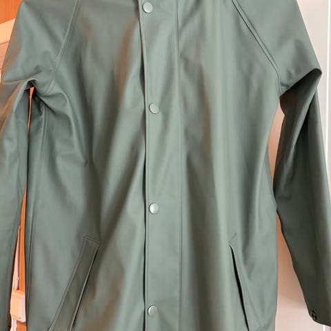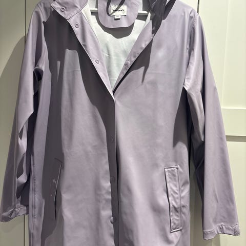 Pent brukt regnjakke/-kåpe til jente. Lyseblå/lilla. Lukkes med knapper. Mangler "front" på et knappefeste, men har ingenting å si for funksjon.