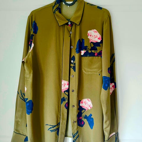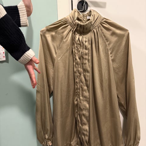 Ganni bluse i størrelse S, laget av cupro (kobbersilke). Cupro er en luksuriøs, silkeaktig kunstfiber som er laget av naturlige materialer og er et godt valg hvis du vil ha et stoff med silkefølelse, men med et mer miljøvennlig fotavtrykk. Blusen har en beige farge. Er som ny da den ikke har blitt brukt men har krøllet seg under lagring/flytting. Løser seg med en runde med steamer.