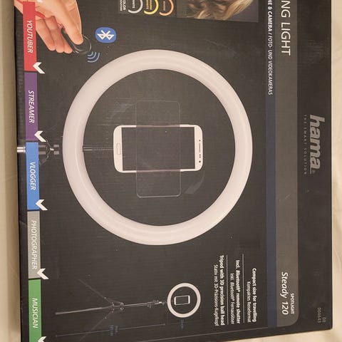 LED-ringlys fra Hama til mobiltelefon på fleksibelt stativ. Mulighet for å justere både fargetone og lysstyrke, og følger med en uåpnet bluetooth-kontroller. Kun brukt en liten uke innendørs for noen år siden, ellers oppbevart i skap. Det følger med stativ, veske til oppbevaring/bæring og bluetooth-kontroller til selve lysringen. Svært enkelt å bruke og mange justeringsmuligheter. Eneste man trenger i tillegg er en adapter til stikkontakt, vanlig USB-tilkobling f.eks. eldre mobillader-adapter.