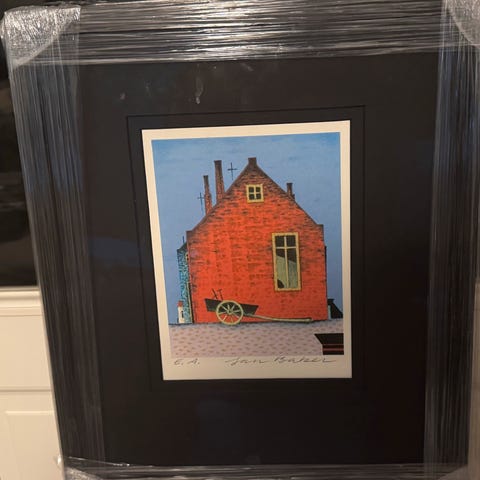 Signert litografi med motiv av nordlys over et hus. Bildet er innrammet med passepartout. Signaturen og nummereringen er synlige på trykket.
