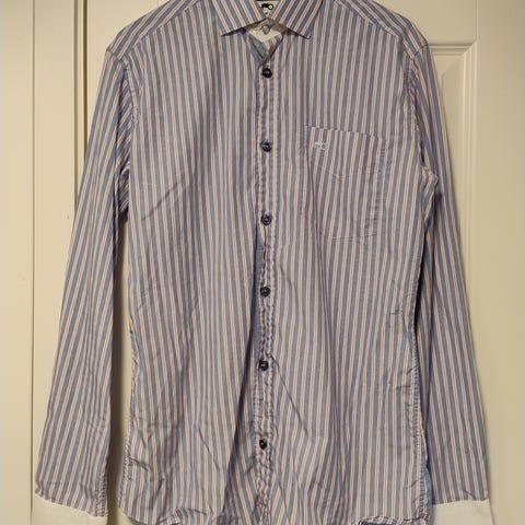 Kul skjorte med bitte små ruter i blått. Fine detaljer med stoffknapp i halsen og rosa på knappehullet på mansjetten