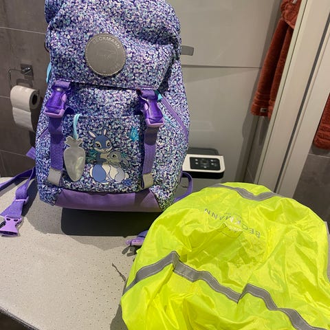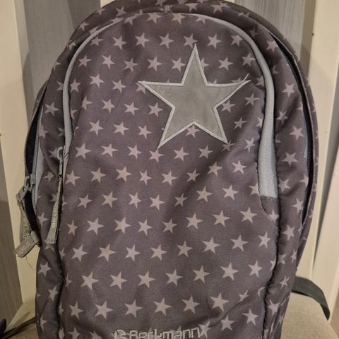 Perfekt barnehagesekk med brystrem og hofterem. Det følger med regntrekk. Vasket en gang før salg. Det er limt på en reperasjonslapp over noe limrester fra en refleks som tidligere har vørt limt på og har falt av. Det er fin plass til å eventuelt skrive navn 👍