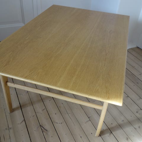 Lite stuebord. Usikker på materialet, men det ligner på flammebjørk. Solid, i god stand. Bordet er lagd i Sverige og er merket med «Möbelfabriks AB Carlsson & Co Bengtfors». H: 46, L: 69,5 44,5 cm.