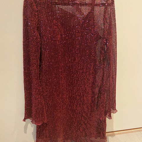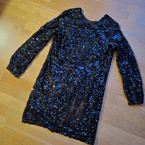 Kun brukt en gang. Paljettene gjør at kjolen får en lilla farge. Nypris 700kr