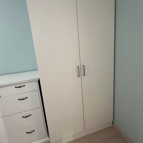 Robust og fint garderobeskap i hvitmalt heltre. Gis bort mot henting.