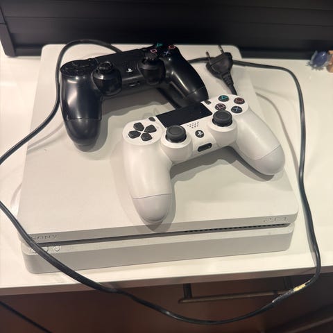 Sony Playstation 4 spillkonsoll i hvit farge. Følger med en svart kontroll og lang ca 2 meter lang lade ledning. Er ca 5 år gammel. Egen ps konto må du ha selv da den er digital så er ingen spill som følger med. Må hentes.