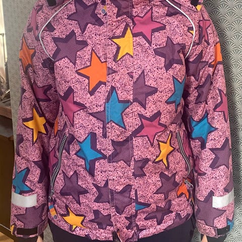 Ingen hull eller flekker, men har litt bruks slitasje ved at den er litt lysere rundt sømmer (se eksempel på bilde). Den er og reparert på det beige stoffet rundt håndleddene (se bilde).