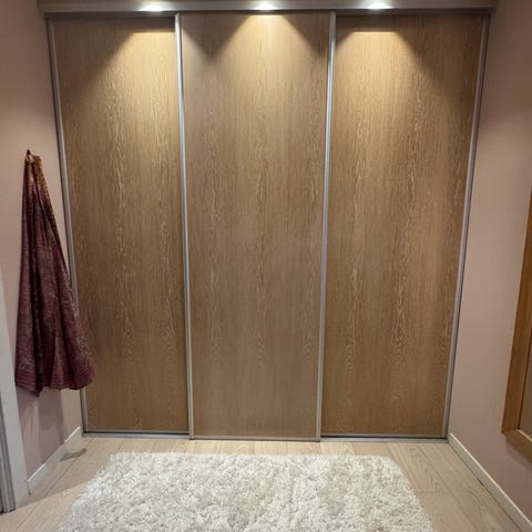 Dørene er fortsatt fine. Toppskinne følger med, men har malingsflekker på seg. Ny bunnskinne må anskaffes.