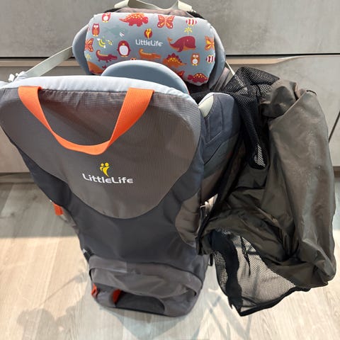 Bæremeis godt brukt men mye bruk igjen. Mange praktiske funksjoner,som avtagbar sekk, isolert lomme, speil.