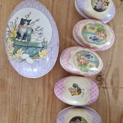 Mange påskeegg som kan fylles med overraskelser som smågodt, skrevne lapper, barnetatoveringer eller andre skatter.