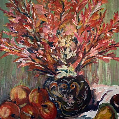Maleri som viser et kirsebærtre i full blomst, med rosa blomster og grønt gress i forgrunnen. Motiv av en hage eller park med et lyst og fargerikt landskap 60x80 cm