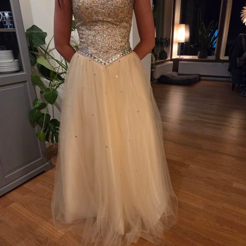 Ballkjole, selskapskjole, festkjole, maxikjole, bryllupskjole. Brukt en gang på skoleball, som ny. Jenta på bildet er 173 cm lang og bruker S til vanlig.