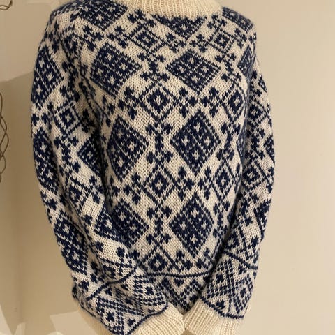 Strikket i Spinnvill garn fra Skappel. Genseren er pent brukt et fåtalls ganger. Selges videre da jeg har denne i flere farger.