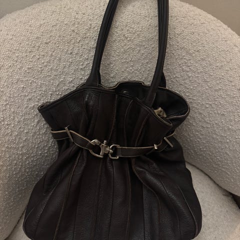 Nydelig og tøff bag fra italiensk merke ca 30x22 cm med skulderrem uten slitasje. Brukt er par ganger selges halv pris. Kommer utenpå, bakpå og inni!