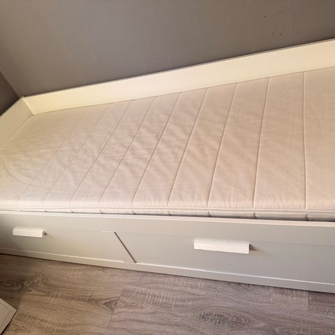 IKEA seng med oppbevaring i hvit farge. Kan trekkes ut til dobbeltseng. ekstra lagring under seng. Selges billig grunnet flytting. God stand. Må hentes senest tirsdag 13/1. https://www.ikea.com/no/no/search/?q=brimnes%20seng
