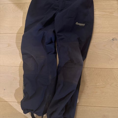 To turbukser fra Bergans selges samlet - en tynn og en mer vannavstøtende. Knallgode til turbruk eller lek utendørs vår, sommer og høst. Den ene har noen hvite merker på knærne, ellers har den vært litt løs i sømmene fra den var ny. Den andre er pent brukt, men har noe vaskeslitasje. Begge mangler gummistropper.