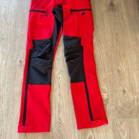 Turbukse i 4-veis stretchmateriale med formsydd kneparti, 2-veis glidelåsåpning nede på beina, frontlommer og lårlommer med glidelås. Borrelås for justering av beinvidde. Super turbukse, men jeg ble ikke komfortabel med herremodell. Kun brukt på kort tur 2 ganger.