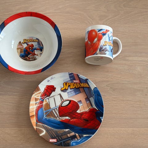 Kjøpt nye på Sprell for en del år siden. Barneasjettene er laget i praktisk og slitesterkt plastmateriale. Antiskliringen på undersiden er slitt vekk, og tallerknene har noe bruksspor, men er ellers i fin stand, med mye bruk igjen. Se bilder for detaljer.