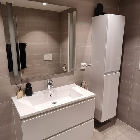 Baderomsmøbler/baderomsinnredning selges. Høyskap: 170cm høyt 38cm bredt og 33cm dypt. Servantskap 210cm bredt, 41cm høyt, 54cm dypt. Lakkerte eikeskrog, eik inmat i skuffer, Corian benkeplate. Møblene er laget av møbelsnekker.