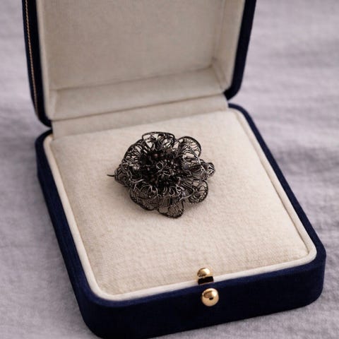 Stor vintage blomsterbrosje i mønstret filigran. Den er sølv med perle i midten(ikke ekte perle).