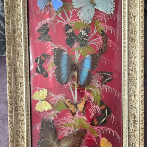Unikt vintage dekorbrett fra Brasil med motiv i ekte sommerfuglvinger (butterfly wing art) bak glass.