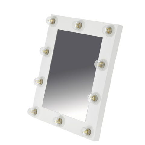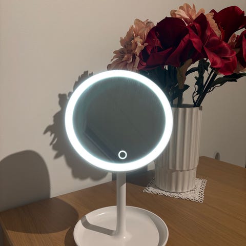 Sminkespeil med lys. Kan lukkes, vippes etter ønske og brukes med adapter (følger med) eller batteri (følger ikke med). Ca. 18 cm × 28 cm.