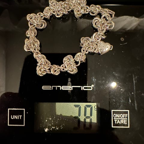 Håndlaget og helt ny fra nedlagt gullsmed. Den er ikke stemplet, men det er 830 sølv.