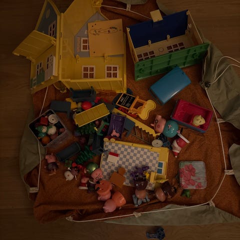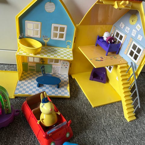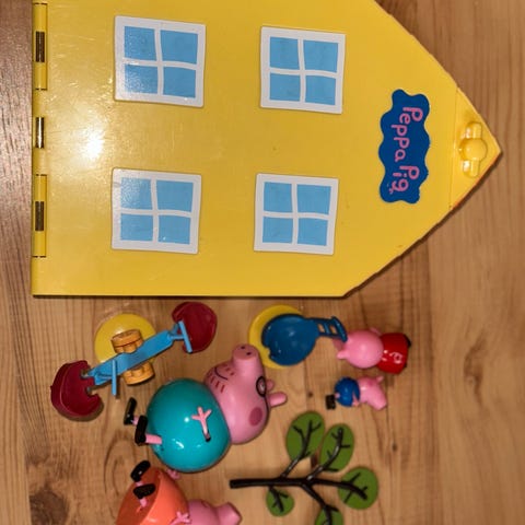 Peppa Gris lekesett med dukker og tilbehør. Inkluderer flere figurer og møbler som kan brukes i lek og rollelek.
