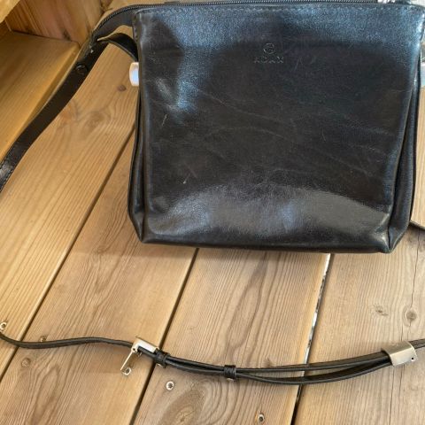 Kvalitetsveske i skinn av merke Adax selges hbo 150,- pluss frakt. Enkelte bruksspor, men hel og fin, se bilder. Str 25x30 cm, skulderrem ca 170 cm. Lomme med glidelås inni og lomme med magnetlås og snøring utenpå. Glidelåslukking øverst.