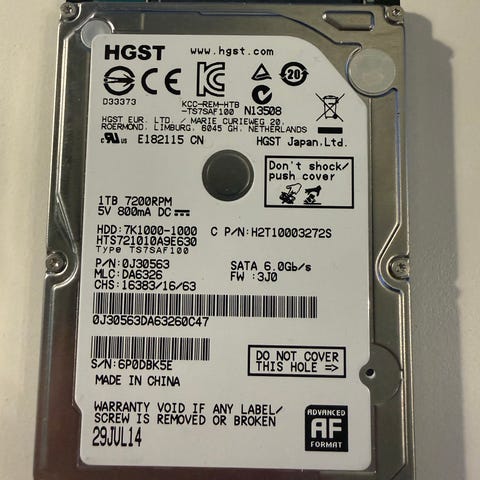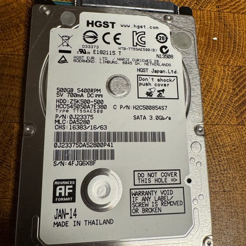 HGST Travelstar harddisk med en lagringskapasitet på 500GB og størrelse på 2,5 tommer. Harddisken er produsert i Thailand og har SATA-grensesnitt.