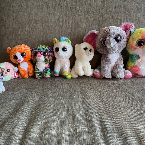 Ty Beanie Babies kosedyr sett med flere forskjellige dyr i ulike farger og størrelser. Laget av mykt materiale, egnet for barn.