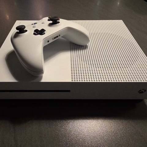 Xbox One S konsoll i hvit farge. Konsollen har standard design og er kompatibel med Xbox One-spill og tilbehør.