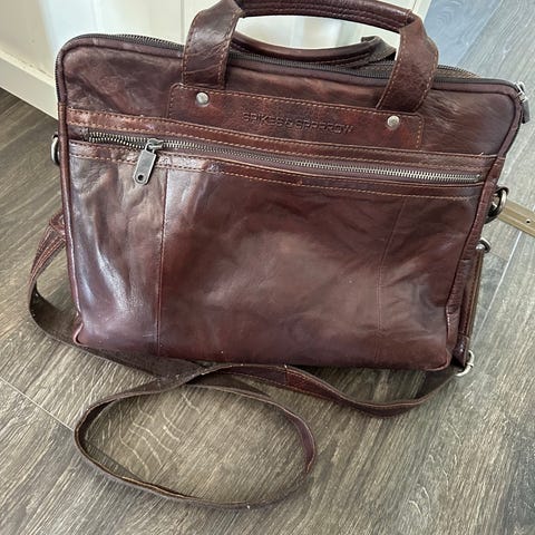 Allsidig veske ekte, brunt skinn med flere lommer og innerlommer.