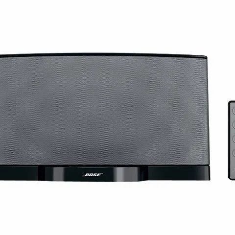 Bose lydstasjon med fjernkontroll. En kompakt lydenhet med integrert høyttaler og dokkingstasjon for lydavspilling. Har en fjernkontroll for enkel betjening.