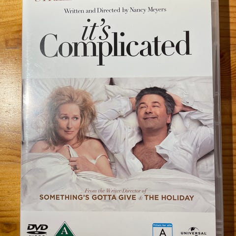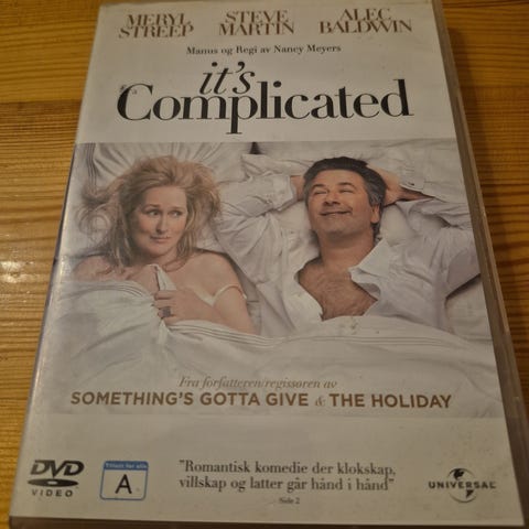 DVD-film med tittelen It's Complicated. Språk: Engelsk. Undertekster: Norsk, svensk, dansk, finsk, engelsk. Sjanger: Komedie, romantikk.