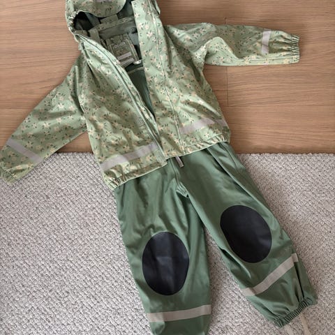 Sett består av jakke og bukse, og har vært brukt av én gutt i barnehagen på regnfulle dager gjennom høst- og vintersesongen.