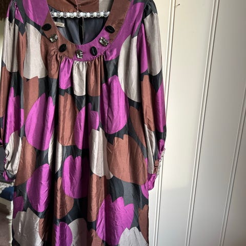 Lang kjole i silke og viskose. Ukjent designer, kjøpt på Paleet, Oslo. Ingen bruksmerker.