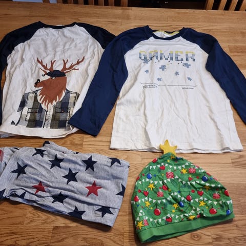 2 delt nattpysj, bestående av genser og bukse. Som vist på bilde 3 er det et lite hull i armen på genseren.