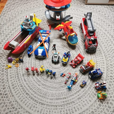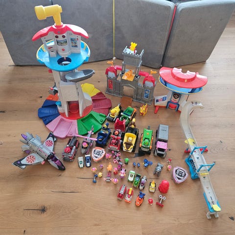 Fult fungerende paw patrol tårn, biler og masse figurerer selges samlet, noe synlig brukt og noe ser ut som nytt. Zuma sin bil er med lyd og lys, Everest, Marshal og Sky bilene har bevegelige deler.